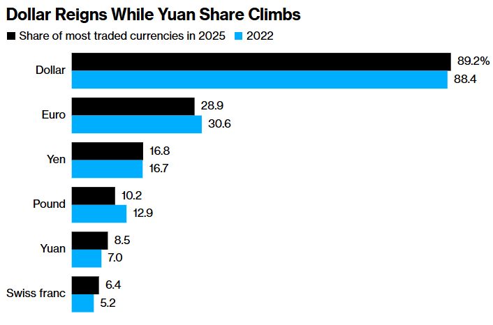 国际清算银行9月份发布的三年一度的调查显示,美元继续主导全球外汇市场,在所有交易中占比高达89.2%,高于2022年的88.4%。欧元的份额从30.6%下滑至28.9%,而日元的份额则基本保持稳定,为16.8%。