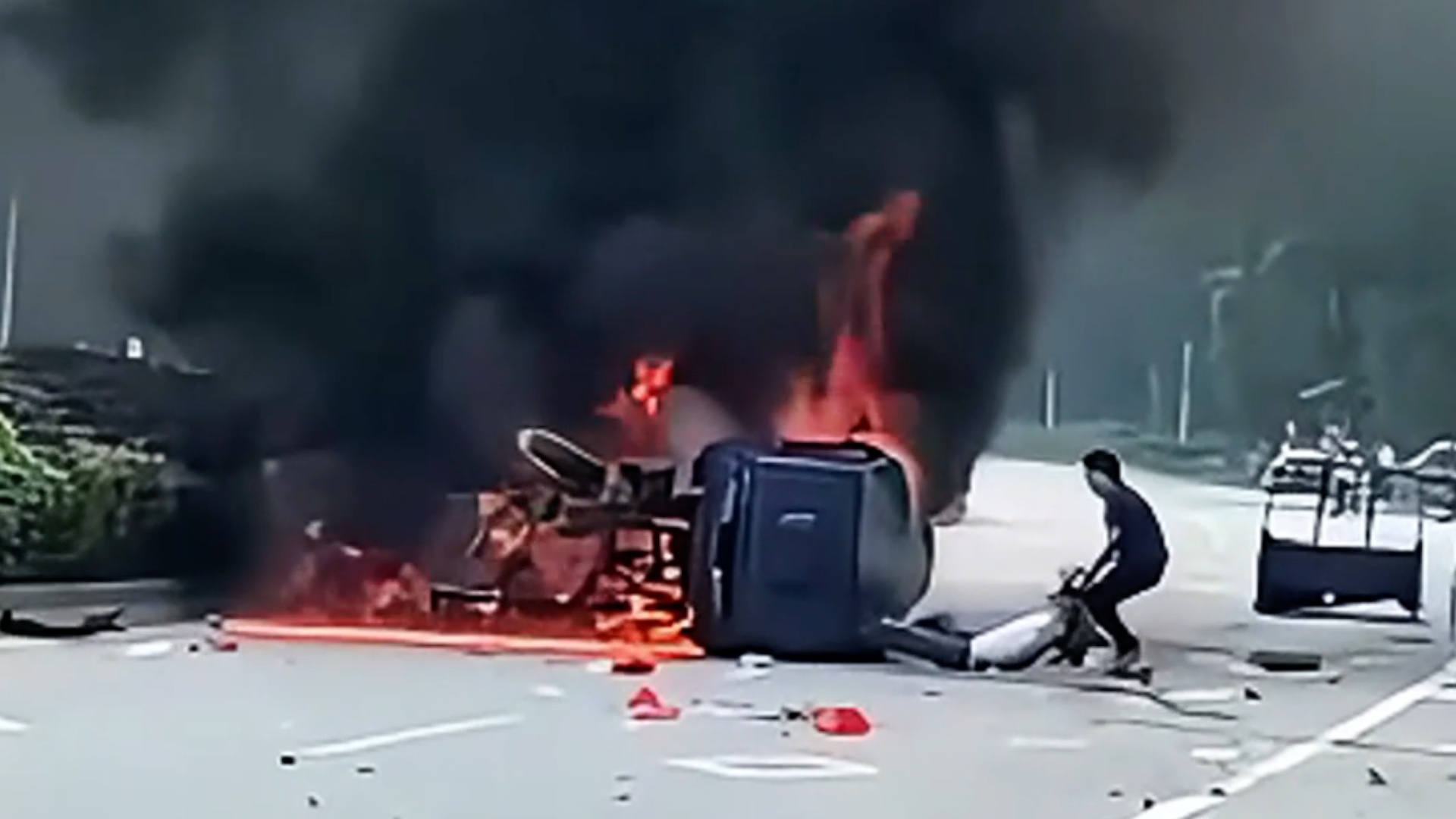 广东韶关市始兴县沈所镇农业农村办主任钟威路过见到事故场景,发现三轮车前面的挡风玻璃已经碎掉,司机的头被卡住。他立即冲进火场,但被巨大的火焰吓得后退几步。